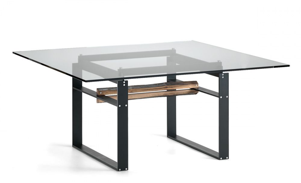 Стол с базой из стали, окрашенной в гофрированный белый (GFM71), черный (GFM73) или графитовый (GFM69) цвет, центральная балка в натуральном массиве ореха Canaletto (NC) или в стали, окрашенной в белый (GFM71), черный (GFM73) или графитовый (GFM69) цвет. Столешница из прозрачного или сверхпрозрачного стекла толщиной 15мм. Столешница лежит на основании.