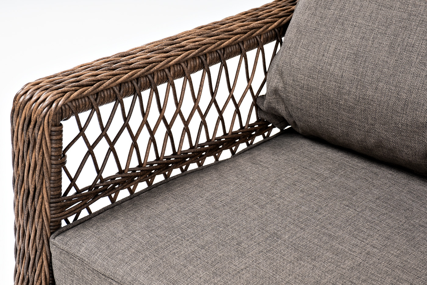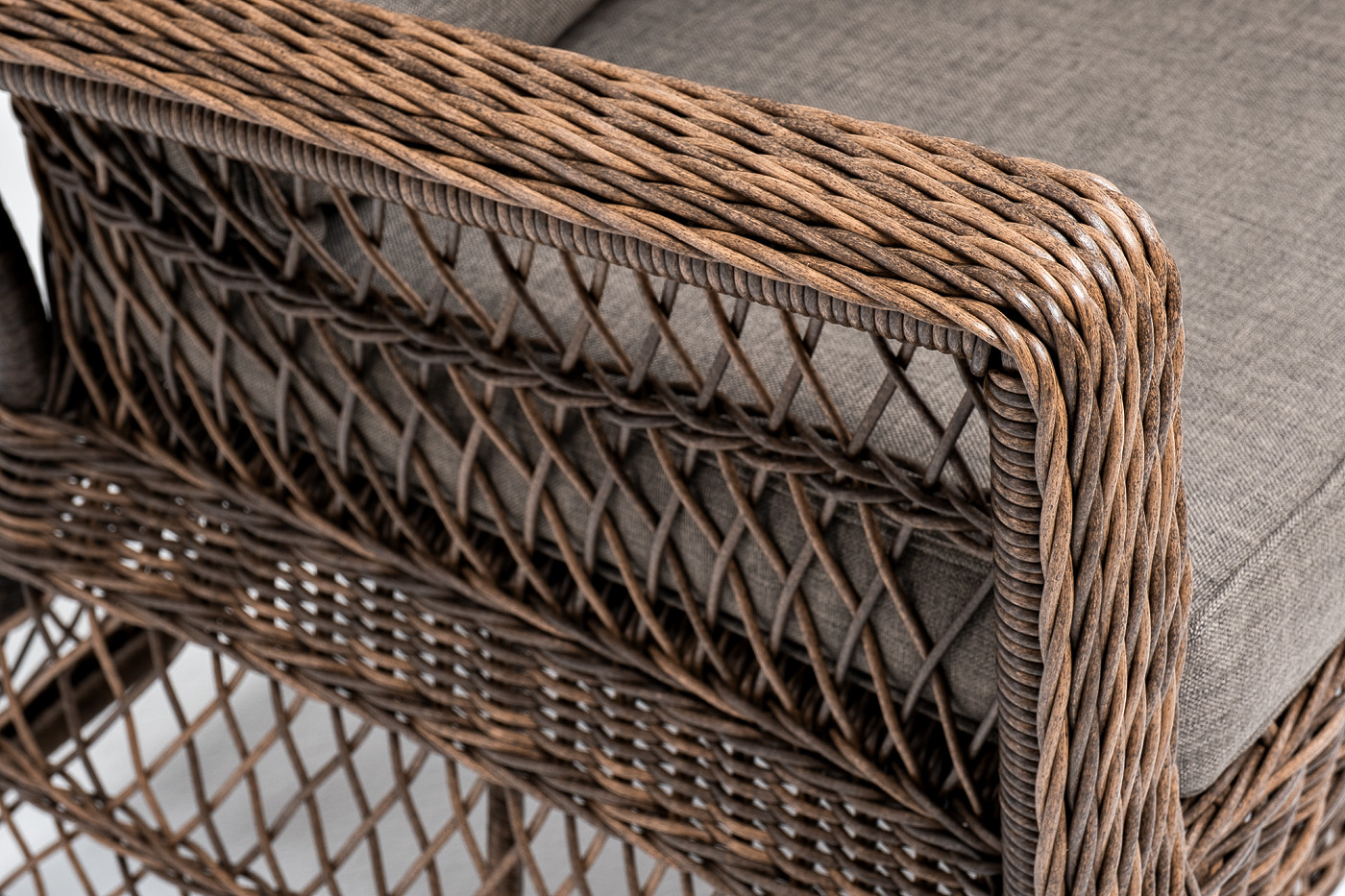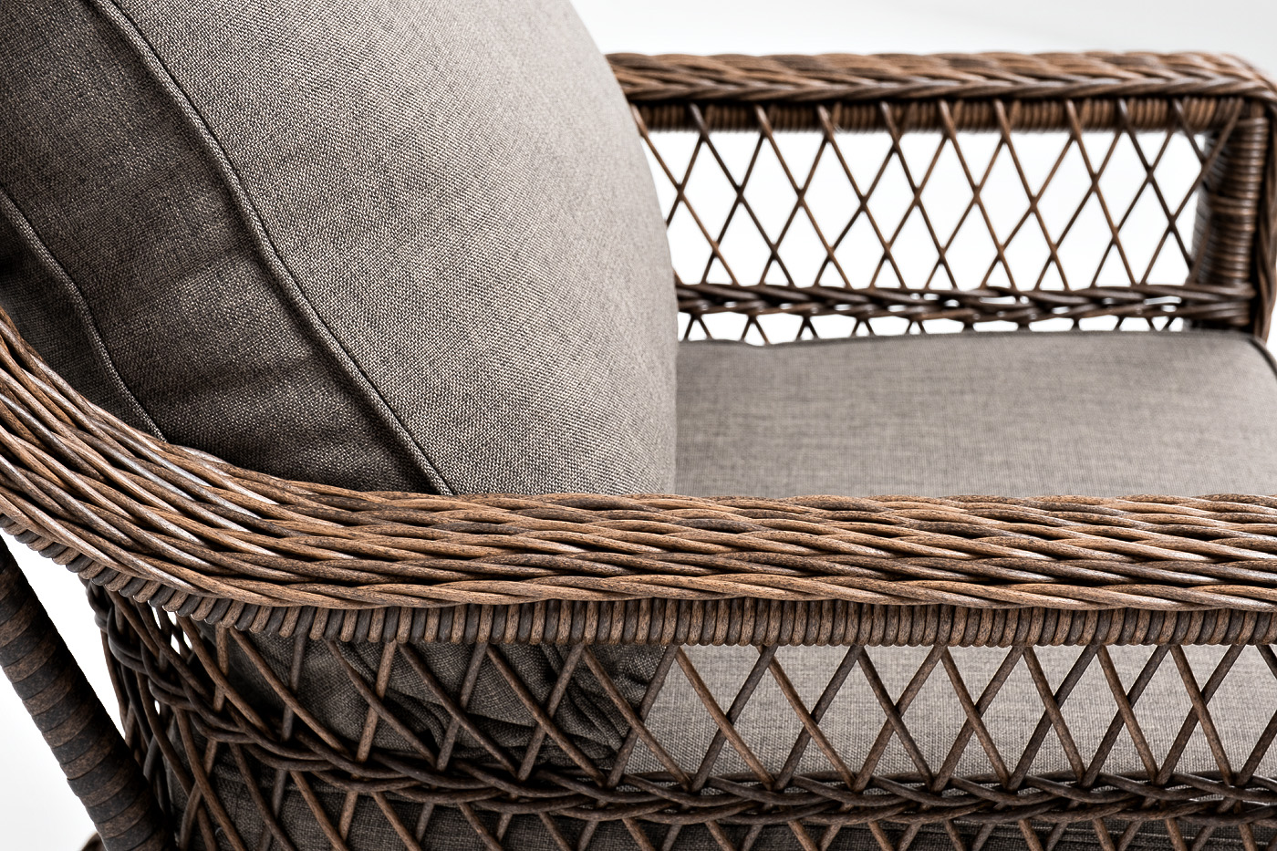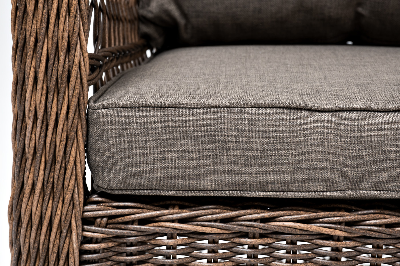 Укомплектовано плетеное кресло удобными мягкими подушками, одна из которых располагается в области спинки. Они выполнены в серо-коричневом оттенке. При пошиве тканевых изделий используется полиэстер, плотностью 230гр/м2. Он в обязательном порядке проходит обработку влагоотталкивающей пропиткой.