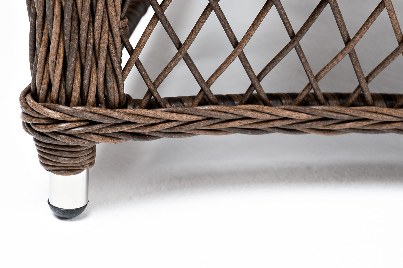 Кресло изготовлена из устойчивого алюминиевого каркаса. Искусственный ротанг украшает мебель в качестве круглого ручного плетения. Оно представлено в коричневом цвете.