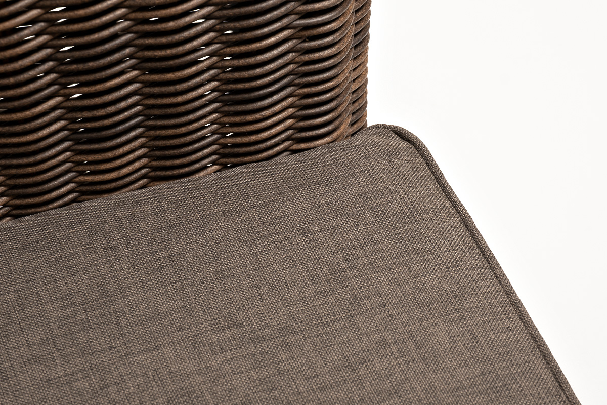Кресло оснащено каркасом из прочного алюминия, ручное круглое плетение является основным декоративным элементом мебели. Оно выполнено из искусственного ротанга в коричневом цвете.