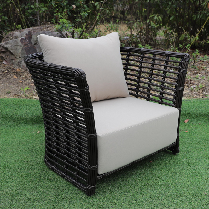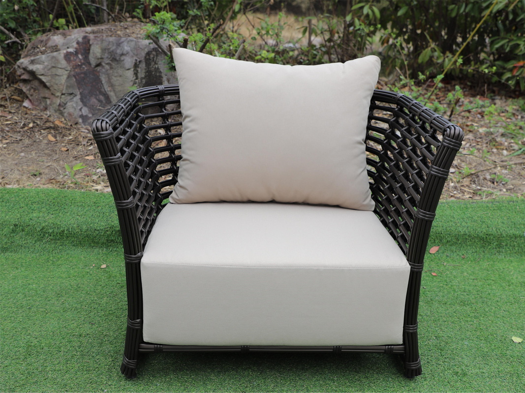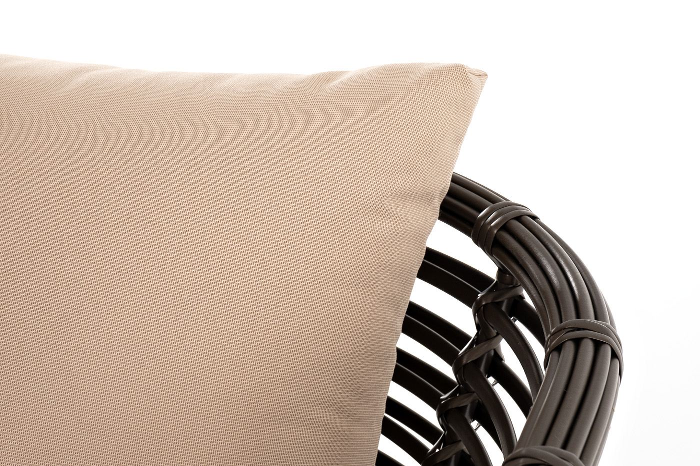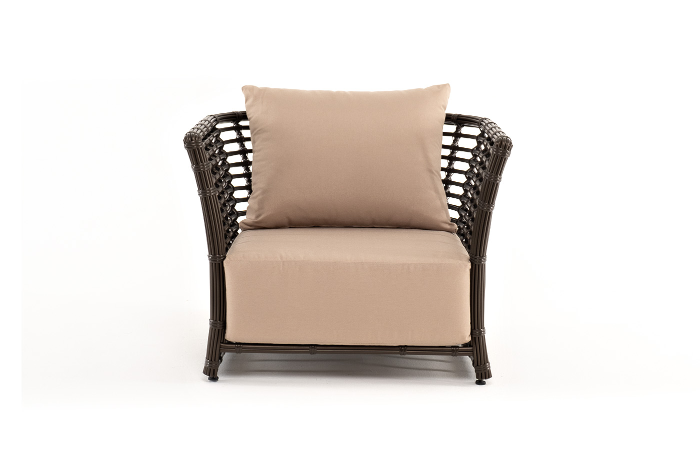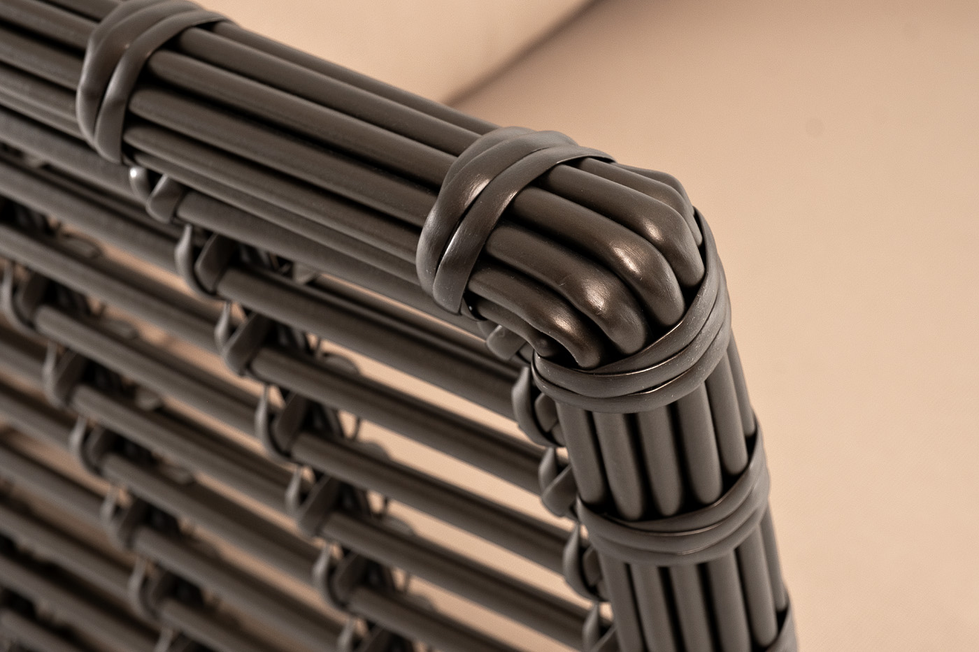 Кресло оснащено каркасом из прочного алюминия, ручное круглое плетение является основным декоративным элементом мебели. Оно выполнено из искусственного ротанга в бронзовом цвете.