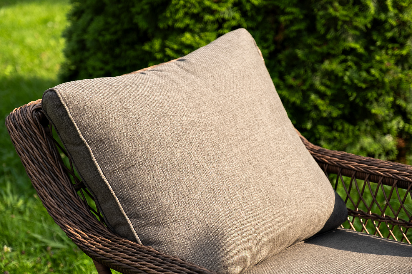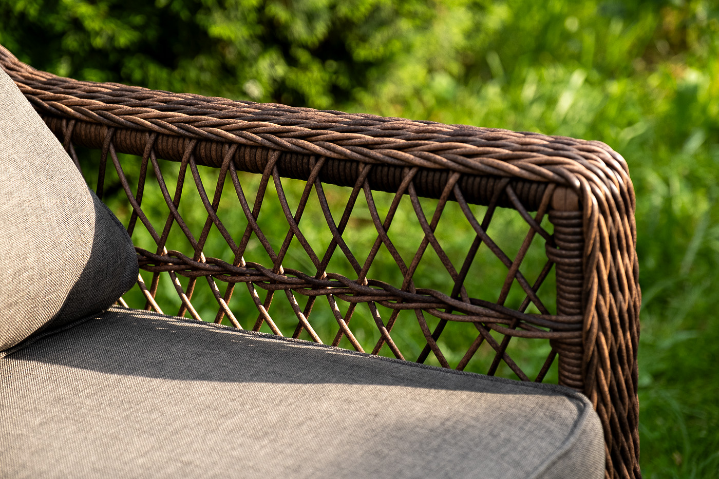 Уличная мебель имеет алюминиевый каркас, ручное плетение, сделанное из коричневого искусственного ротанга. Предусмотрены мягкие подушки из полиэстера серо-коричневого цвета с плотностью 230гр/м2. Они имеет влагоотталкивающую пропитку. Рабочая поверхность столика изготовлена из закаленного стекла толщиной 5 мм.