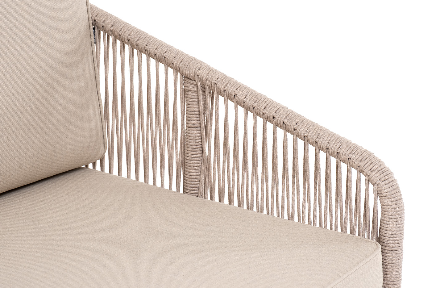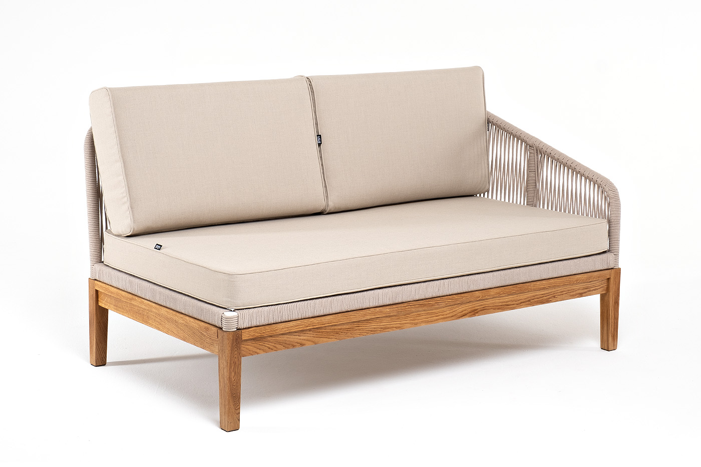 "Канны" левый модуль плетеный из роупа, основание дуб, роуп бежевый круглый, ткань бежевая 052