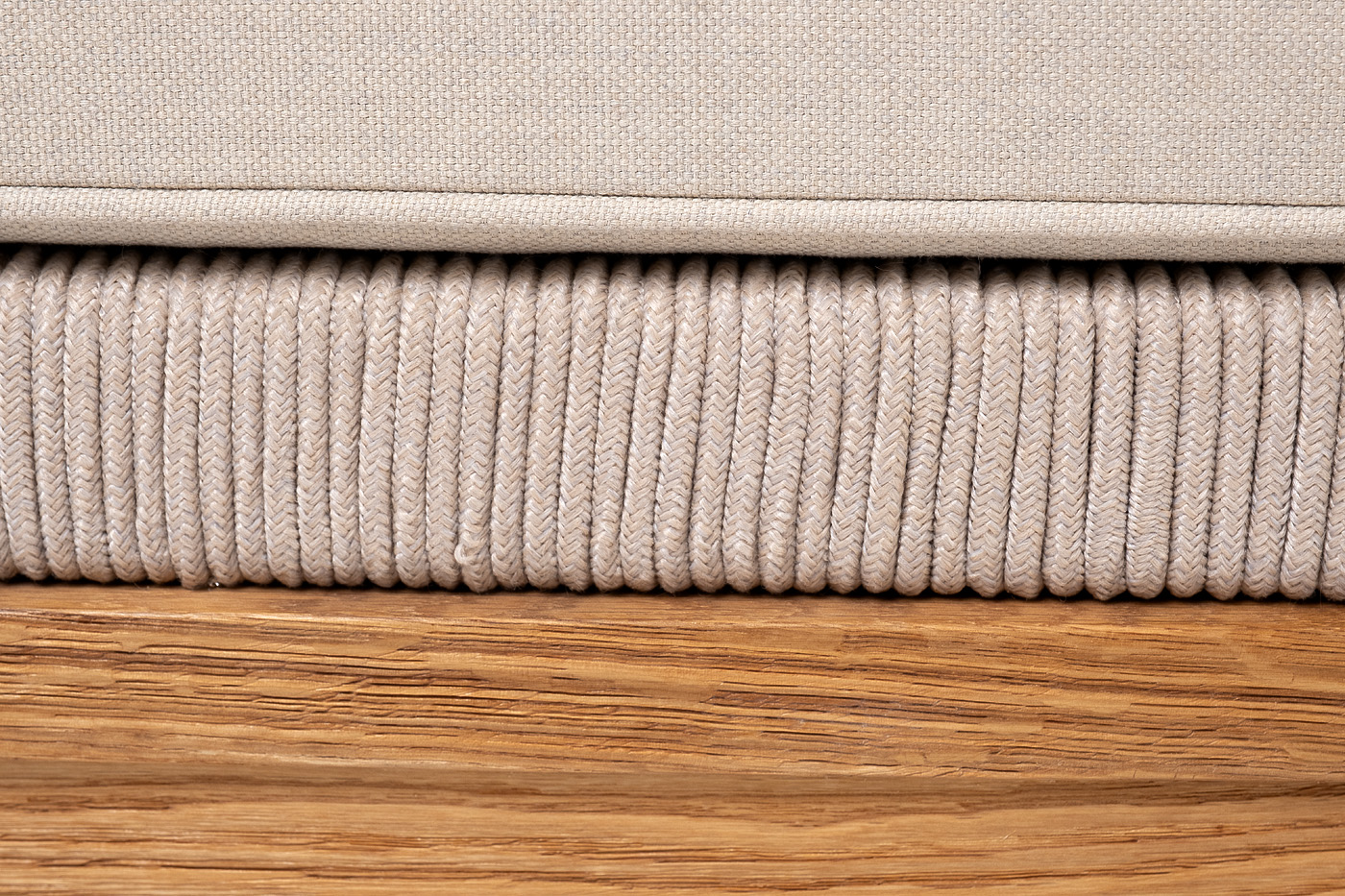 Боковины каркаса вручную оплетены роупом - эластичными синтетическими лентами, изготовленными из высокопрочных полиэфирных волокон. Цвет оплетки - бежевый. Основание дуб.